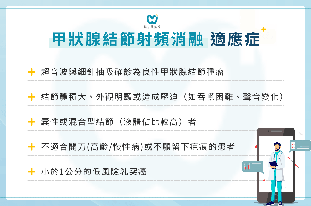 - 囊性或混合型結節(液體佔比較高),特別適合甲狀腺結節射頻消融術
