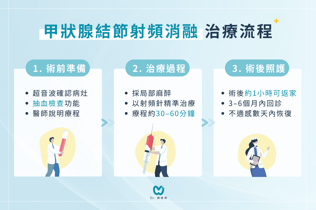 - 3–6 個月內安排回診超音波追蹤結節縮小程度